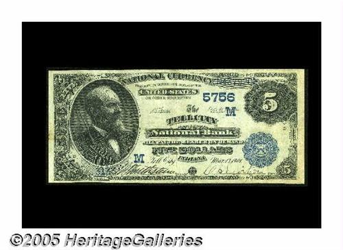 <B>Tell City, IN</B></I> - $5 1882 Date Back Fr. 537 <B>The Tell City NB</B></I> Ch. # (M)5756<BR>A nice pen signed early example from this tough Perry County bank. Sharp <B>Fine-Very Fine.</B></I>