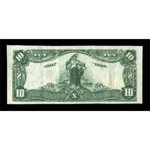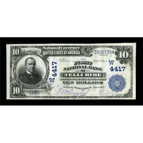 <B>Telluride, CO</B></I> - $10 1902 Date Back Fr. 617 <B>The First NB</B></I> Ch. # (W)4417<BR> This lovely note is listed as AU in the census, and we can well imagine why, as the vivid inks and bold blue pen signatures give the note the appearance of an uncirculated example at first glance. The few folds, however, compel the more realistic grade of <B>Very Fine-Extremely Fine.</B></I> Notes from this mining community are avidly collected, with an EF Brown Back realizing a strong $51,750 in the 2006 Memphis auction. We offered this piece in our September, 2006 sale, where it failed to sell due to a perhaps overly aggressive reserve from a consignor who liked this piece as much as we did. With a considerably lower reserve, it should easily find a new home tonight. <BR><BR><b>Shipping:</b> Coins & Currency (<a target="_blank" href="http://www.heritageauctions.com/common/shipping.php">view shipping information</a>)