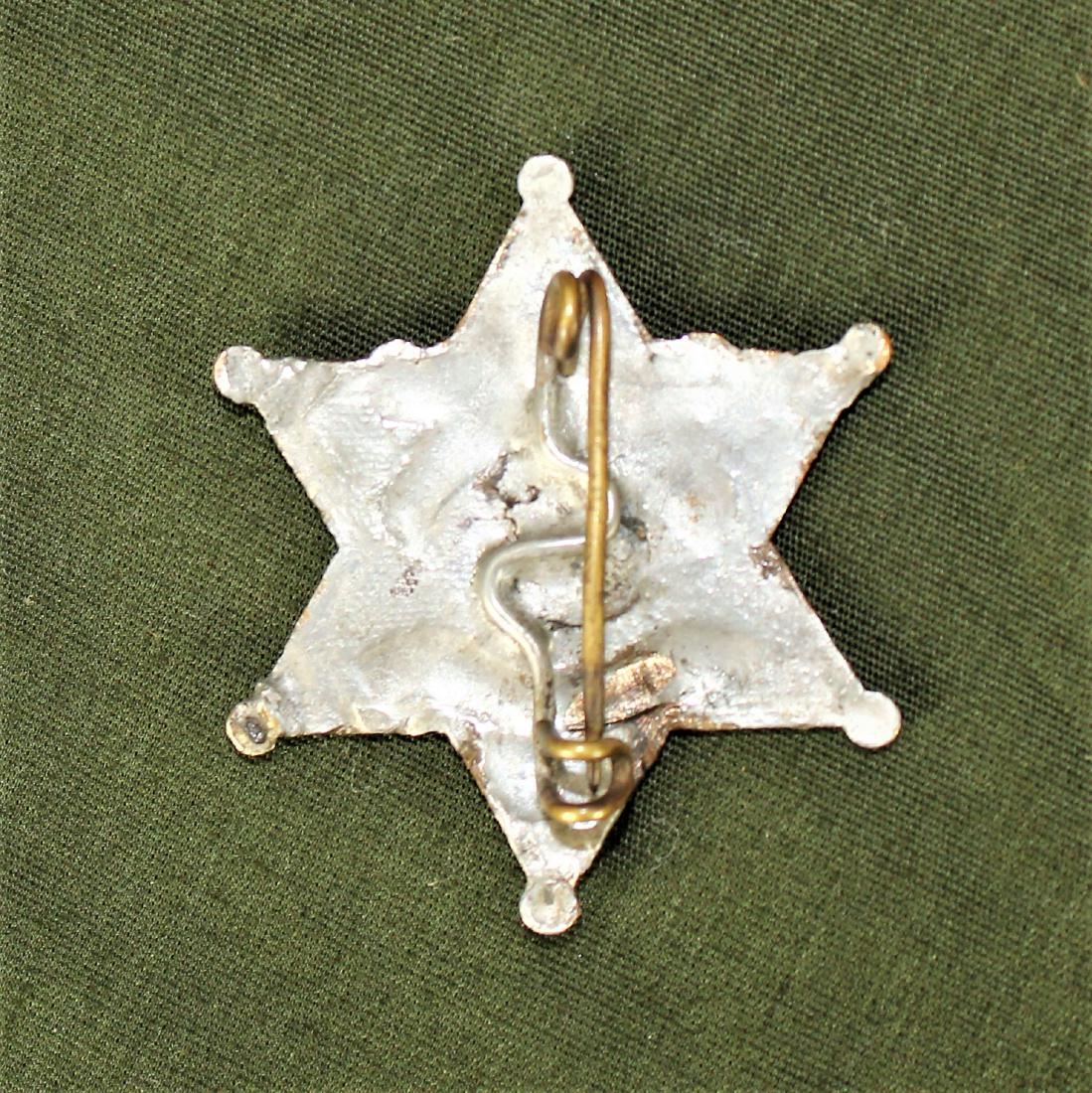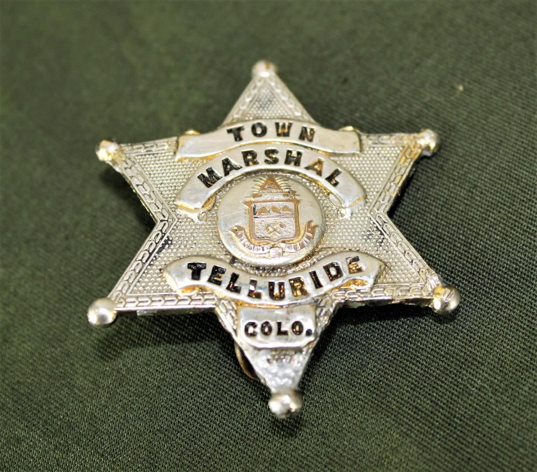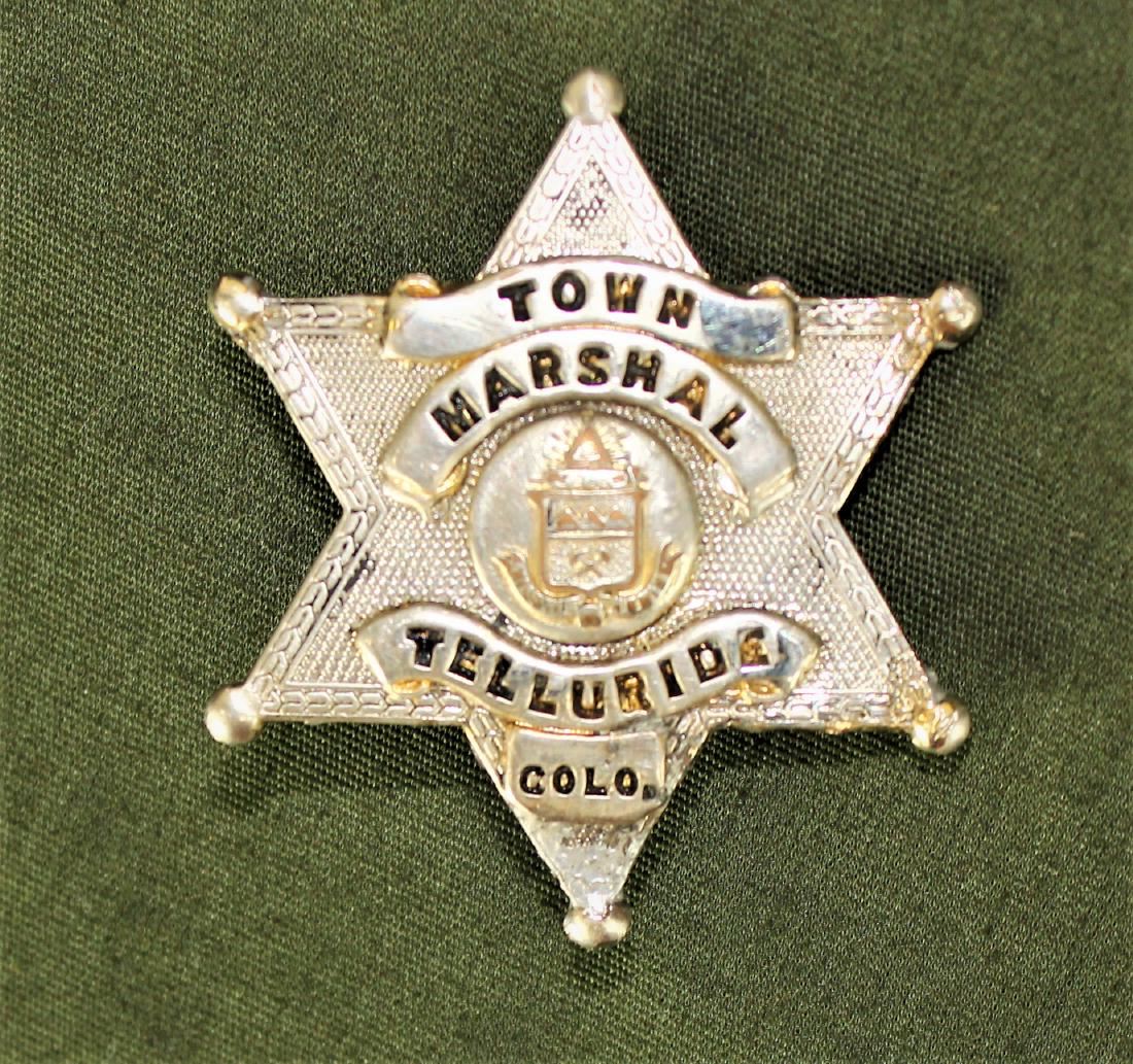 Very desirable Colorado badge, with nicely presenting cast three dimensional design, from historical town of Telluride. Documented in the book "Badges of the United States Marshals". Showing attractive wear and condition. Measuring 1 1/2" in diameter.