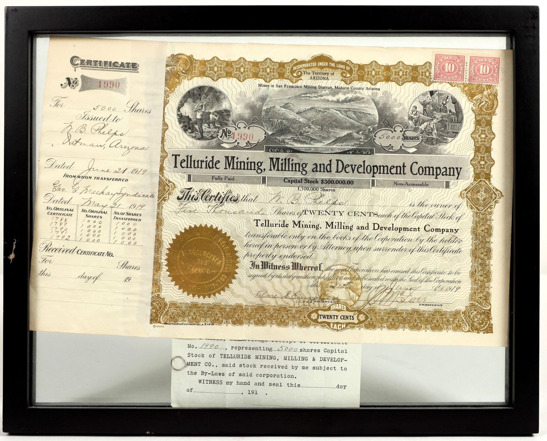This stock certificate was issued to W.B. Phelps for 5000 shares of the Telluride Mining, Milling and Development Company in 1919. Signed by J.L. McIver President. The stock is covered with two mining scenes with a center vignette of the Mohave County district above ground. Gold ink on white paper. Two tax stamps upper right side. A side certificate indicates that Phelps's stock was transferred from the George Mackey Syndicate in May of 1919. Two folds with minor tear at the folds right side. In a float frame at 12 in. X 15 in. stock certificate at 8 in. X 13 in. (ref.Weed, 1918, p. 491). Please see photo for details.