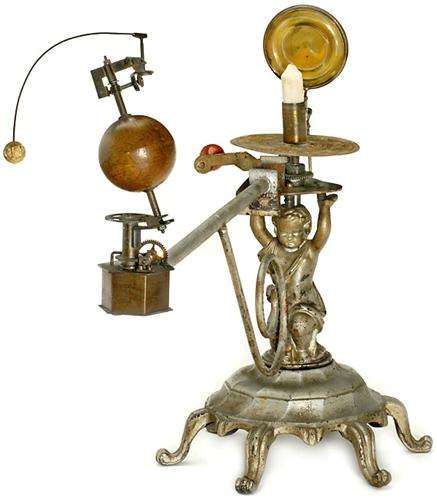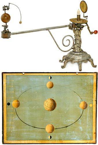 Tellurium und Wandkarte, um 1900 Bezeichnet auf Globus: "Aardglobe te Groningen bij Scholtema en Zoon", aufwendig konstruiertes holländisches Lehrmittel für den Physikunterricht, Erdglobus mit Mond, Handkurbelantrieb für proportional abgestimmte Bewegung, Kerzenbeleuchtung (Spiegel und Kerze ergänzt), mit exzellenter Messingmechanik aus dem 19. Jh., auf gußeisernem Ständer. - Funktioniert sehr gut! - Und: 2) Wandtafel zur mathematischen Geographie von Rudolf Schmidt, "Bewegung des Mondes um die Erde", 90 x 68 cm (!).