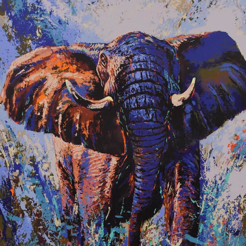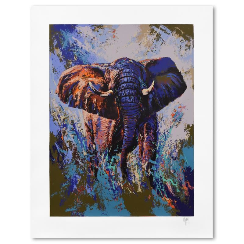"Tembo Elephant" is a limited edition serigraph on paper by Mark King (1931-2014), numbered and hand signed by the artist. Includes Letter of Authenticity. Measures approx. 38.5" x 48.5" (border), 29.5" x 39.5" (image). Please note: due to the age of this piece there is minor wear in the white border area.