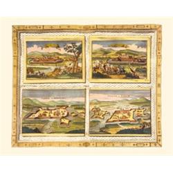 Temesvár, Várpalota, Nagykanizsa és Szigetvár látképe közös lapon. - Színezett rézmetszet