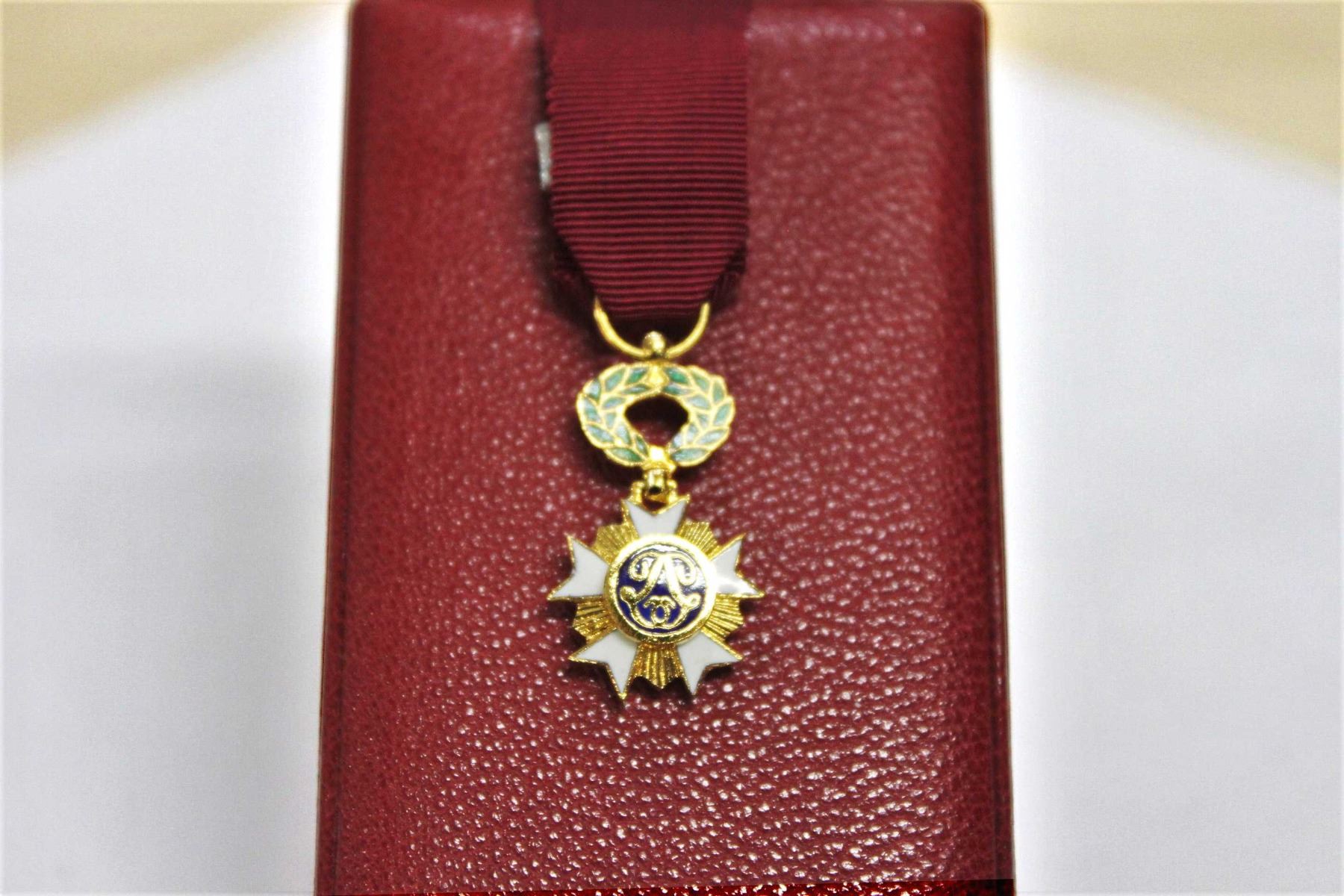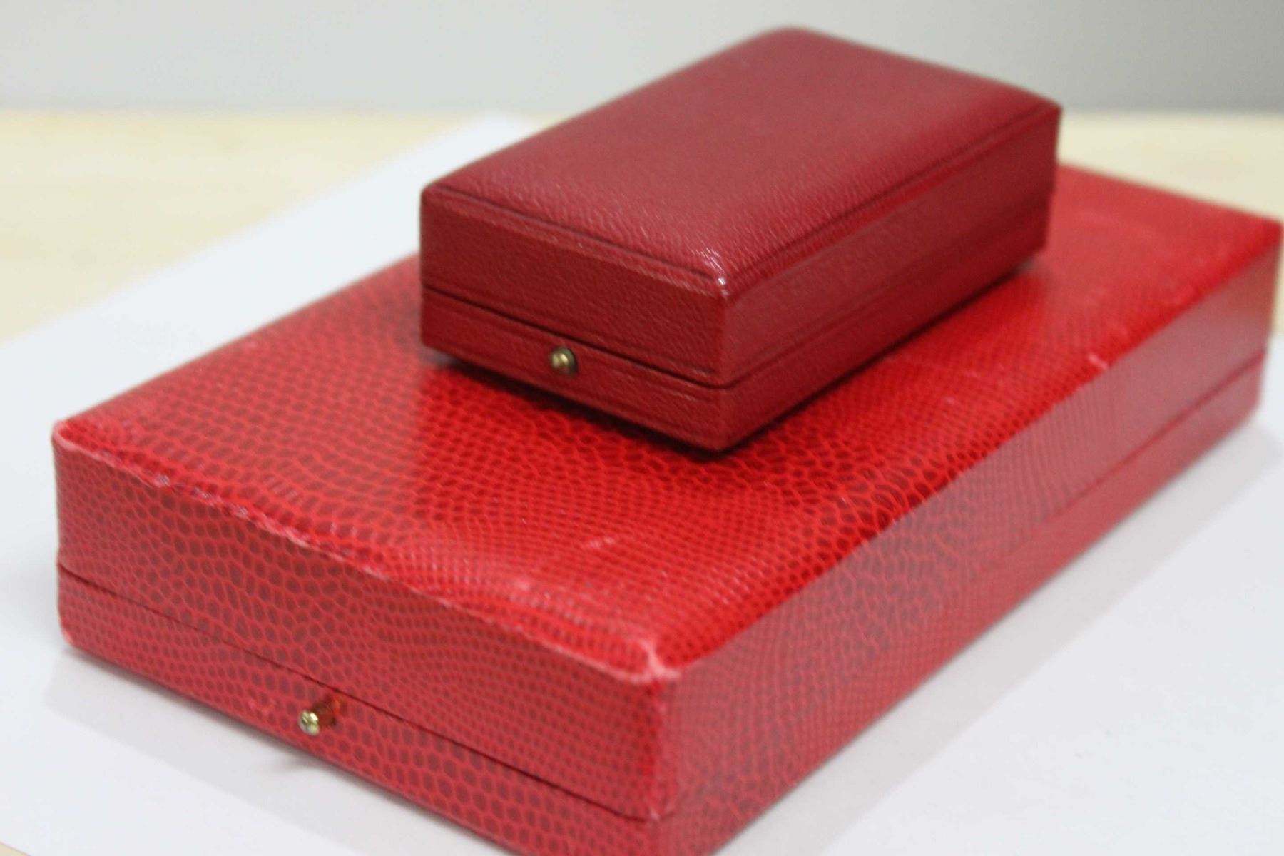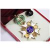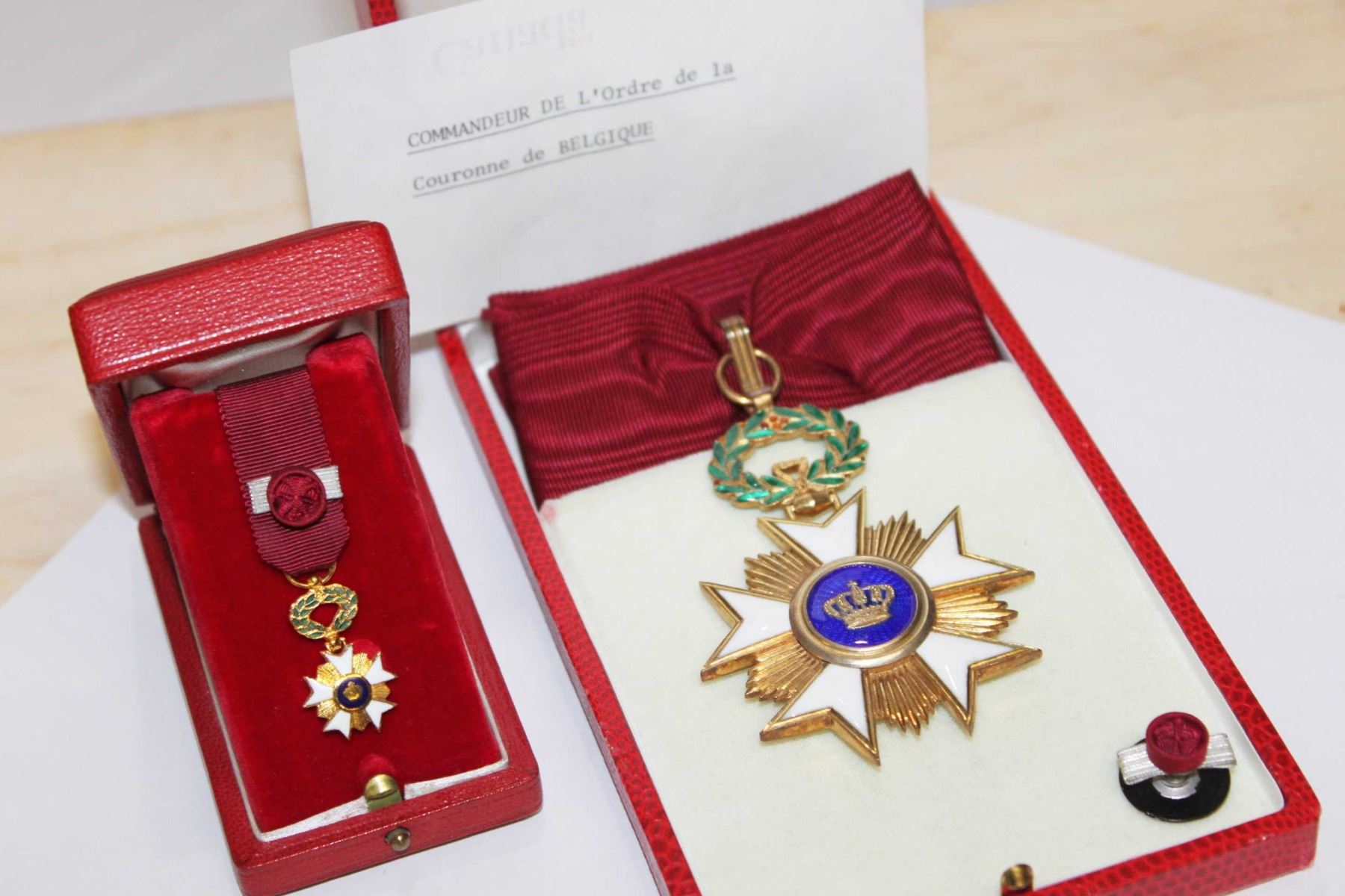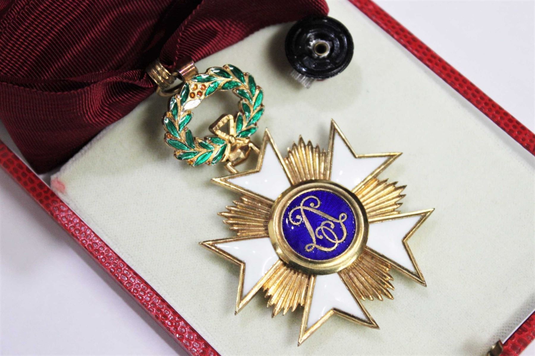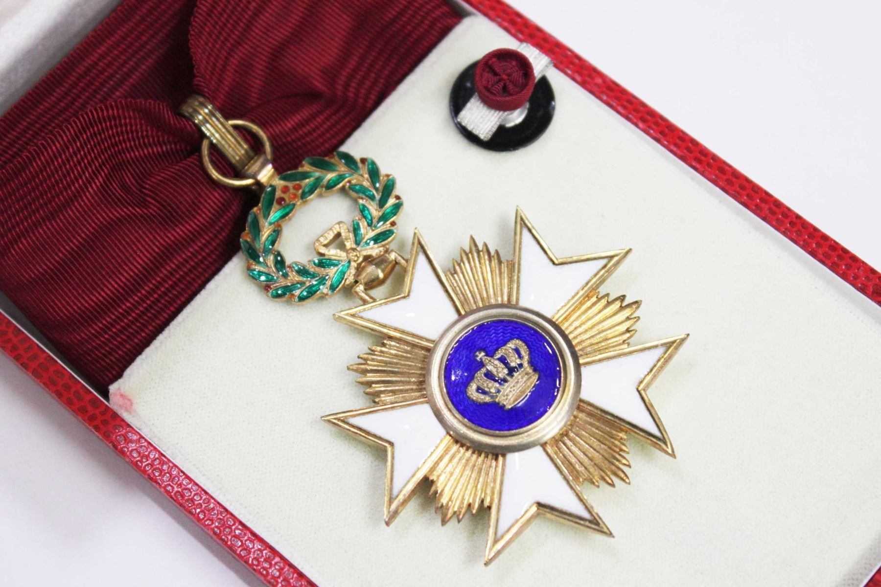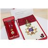 Est. 1897 55 x 80 mm. with maroon neck ribbon, 8 mm. maroon rosette with silver bar lapel pin in a red pseudo snake skin orders box from A.Marie Stuart Palais Royal and a miniature Order of the Crown in its own red box.