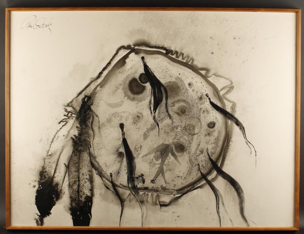 Large black and white round shield with feather and hair decoration. Signed in the lower left corner by the artist. Measures 29 1/2"h x 39 1/2"w.
