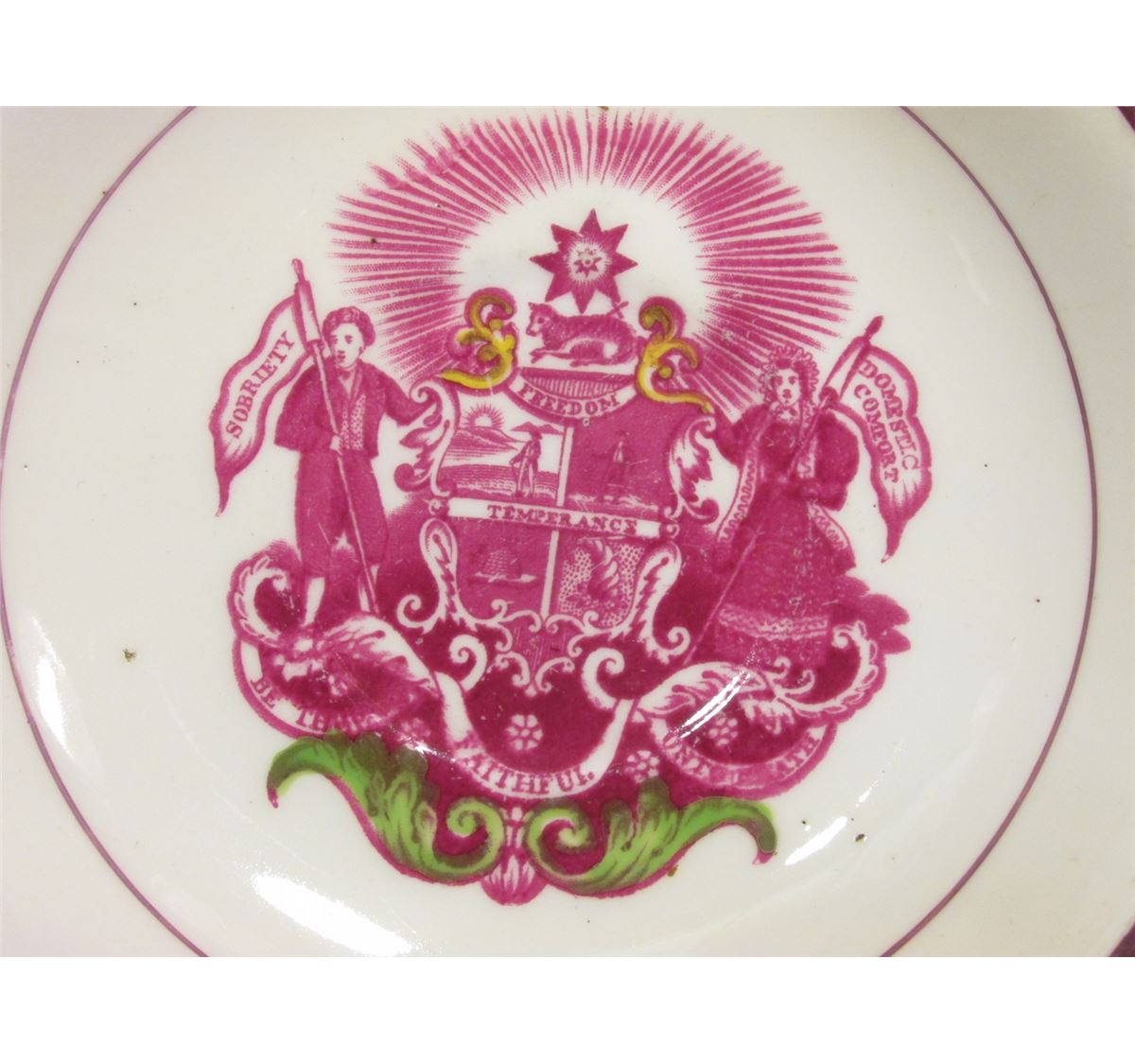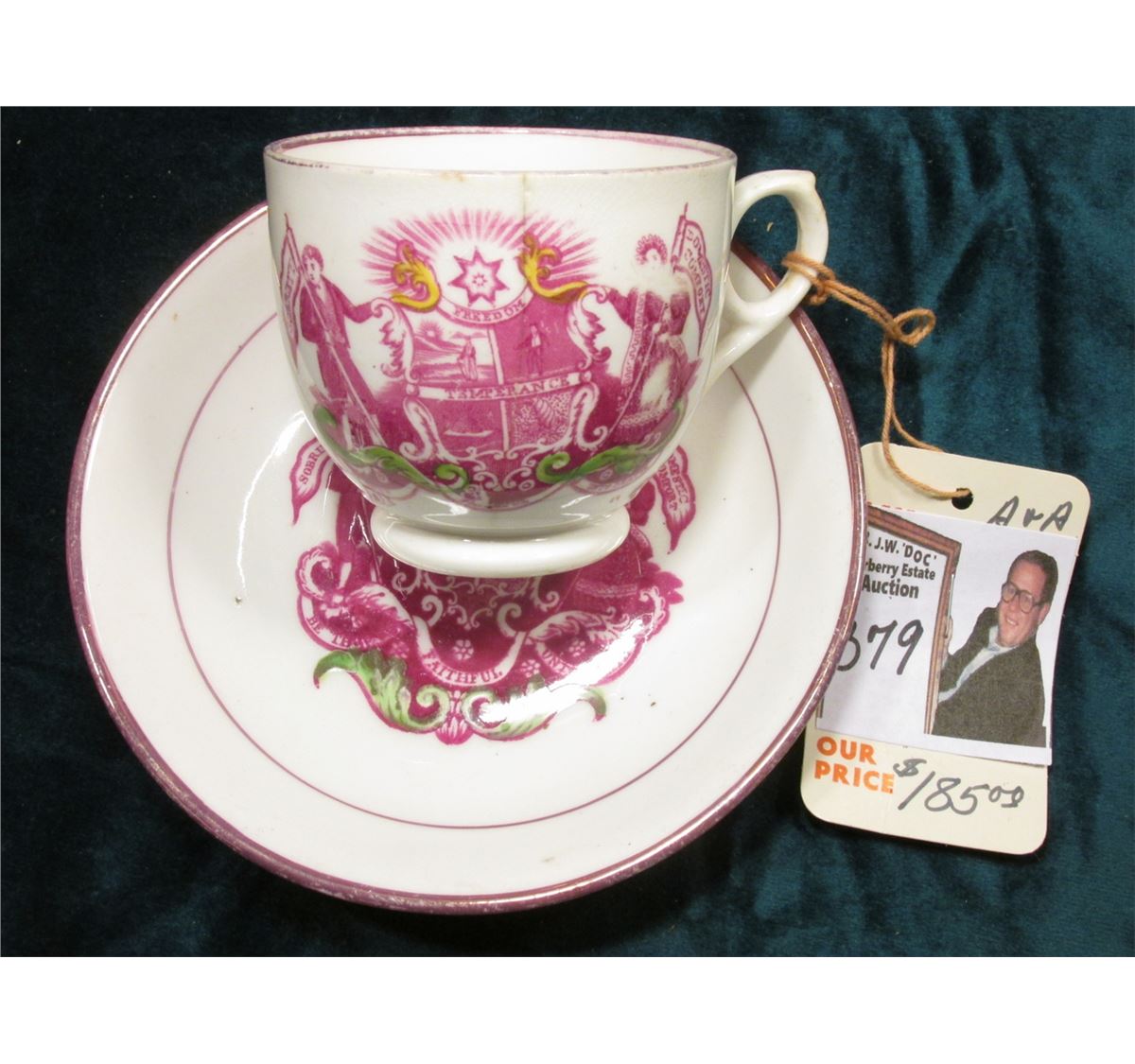 Temperance Tea Cup & Saucer. "Sobriety Domestic Comfort Freedom Temperance", "Be Though Faithful Unto Death", small hairline crack in cup. ENGLISH, MID-19TH CENTURY, approximately 2.1/2 in. high (the cup), 5.5/8 in. diameter (the saucer). 'Doc' Still had it valued at $185.00.