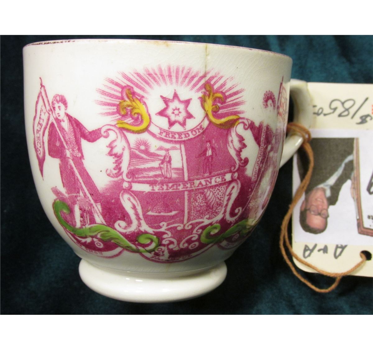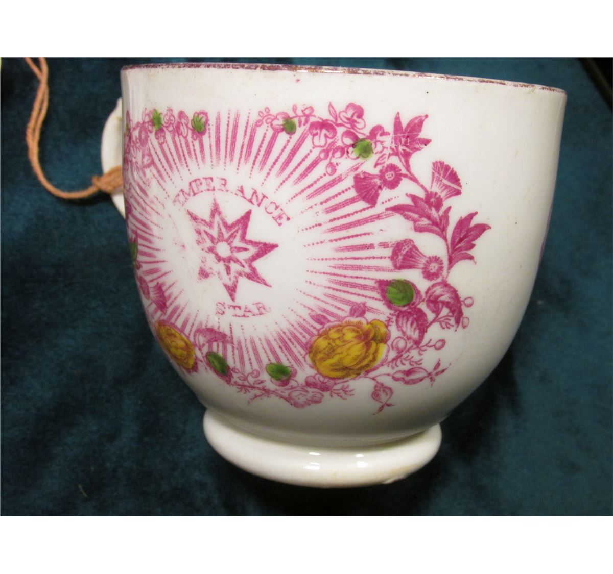 Temperance Tea Cup & Saucer. "Sobriety Domestic Comfort Freedom Temperance", "Be Though Faithful Un