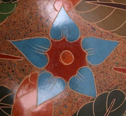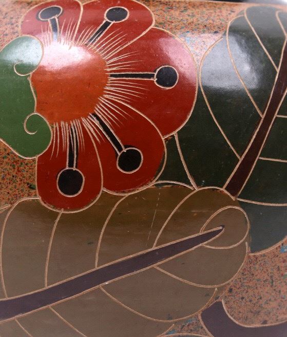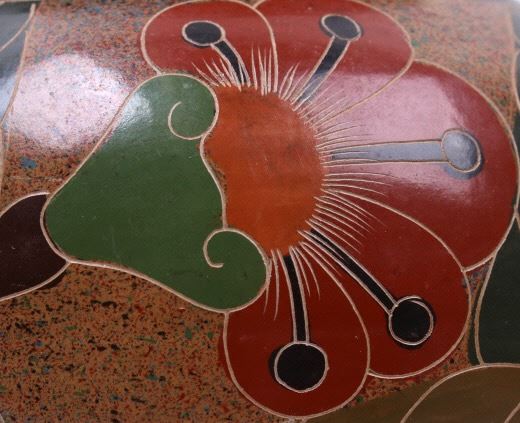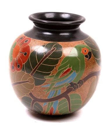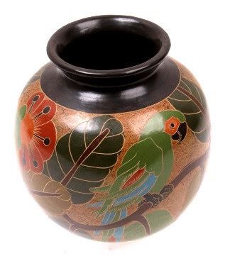 For your bidding pleasure is this Temperate Rain Forest Amazon Theme Pot. This pot is well crafted and wheel thrown. It has delightful coloration to the glaze and stain with a speckled earthy background to the greens of the leaves browns of the branches, to the reds of the floral design, and last but not least the two parrots expertly carved and glazed with a lifelike appearance. The measurements of this pot are 5 7/8" x 5" with a 3 1/4" diameter mouth.