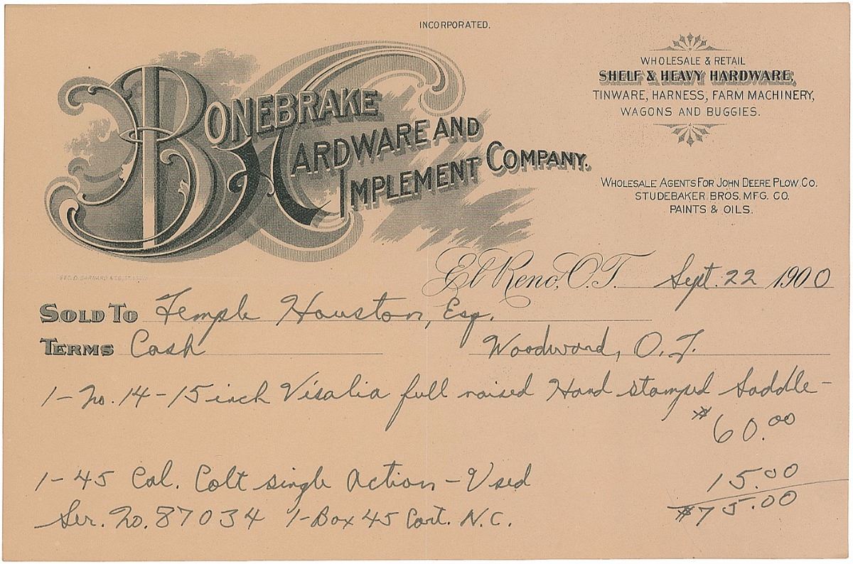 Attorney and Texas state senator (1860–1905) who was the last-born child of Sam Houston, the first elected president of the Republic of Texas. Unsigned document, one page, 8.5 x 5.5, September 22, 1900. Invoice to Temple Houston from the Bonebrake Hardware and Implement Company in the amount of $75 for a “15 inch Visalia full raised Hand stamped Saddle” and a “45 Cal. Colt Single Action.” In fine condition, with expected document wear. Provenance: The Robert Davis Collection.