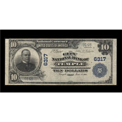 <B>Temple, TX</B></I> - $10 1902 Plain Back Fr. 624 <B>The City NB</B></I> Ch. # 6317<BR>This <B>Fine-Very Fine</B></I> $10 has nice margins with a subtle loss of color from a light washing. The signatures have also faded away. This Bell County bank was in business from June 1902 until its liquidation in June 1931.