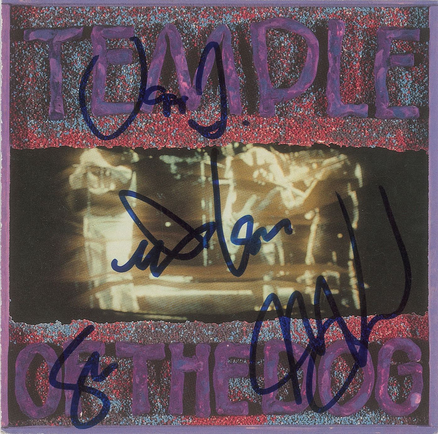CD booklet for Temple of the Dog's self-titled debut album, signed in blue felt tip by Eddie Vedder, Mike McCready, Stone Gossard, and Jeff Ament. In fine condition.
