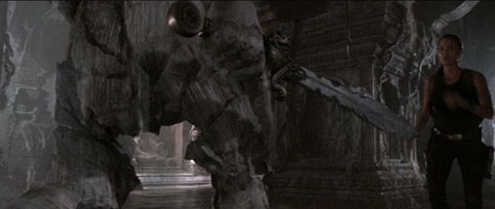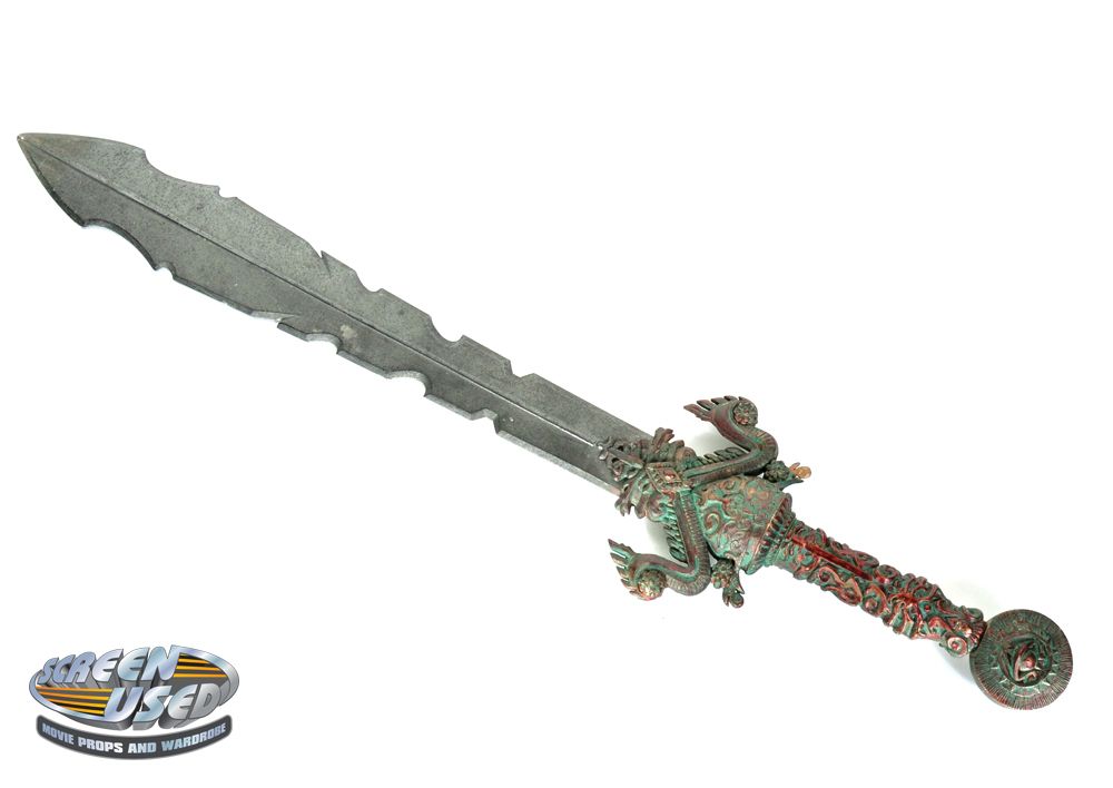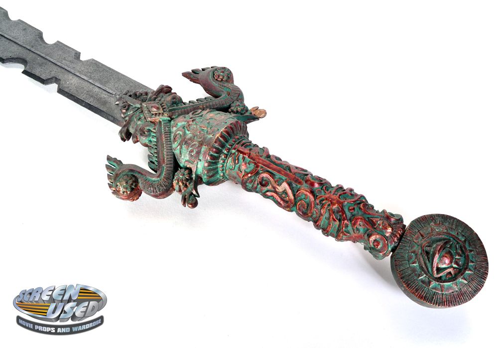 (Paramount, 2001) This is one of the large resin swords custom-made for filming. The swords can be seen on screen as part of the statues that come to life, then Lara Croft takes one of the swords and uses it when fighting the statues. This sword measures 43" long x 7" at the widest section. Some wear from use is visible including a small chipped off section on the handle and minor surface cracks on the blade, otherwise the sword is in very good condition.
