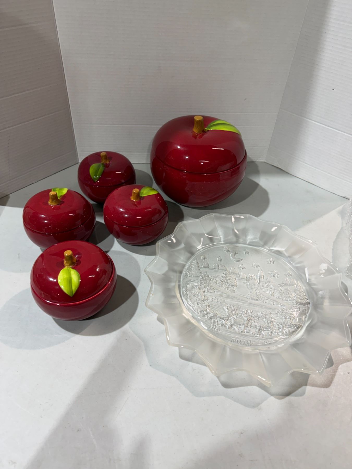 Temptations apple, dishes and a serving tray