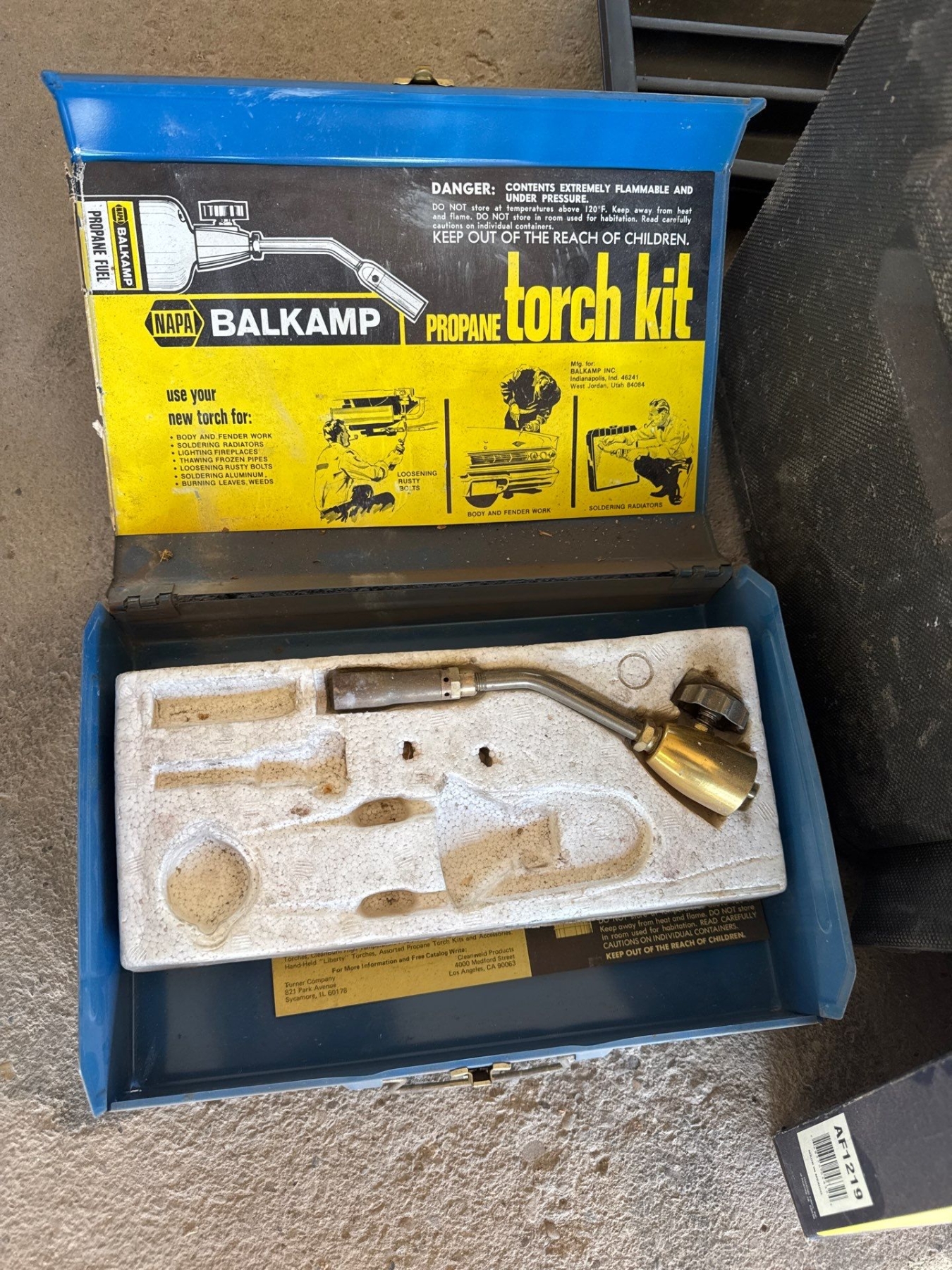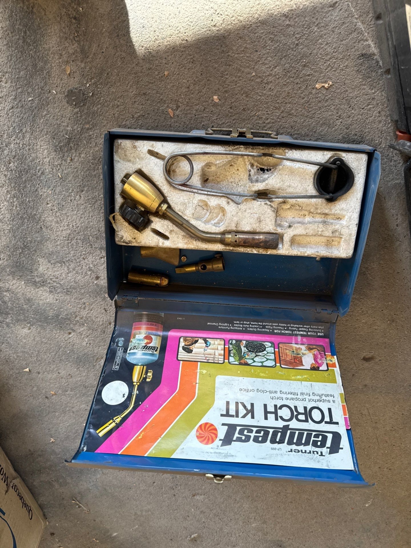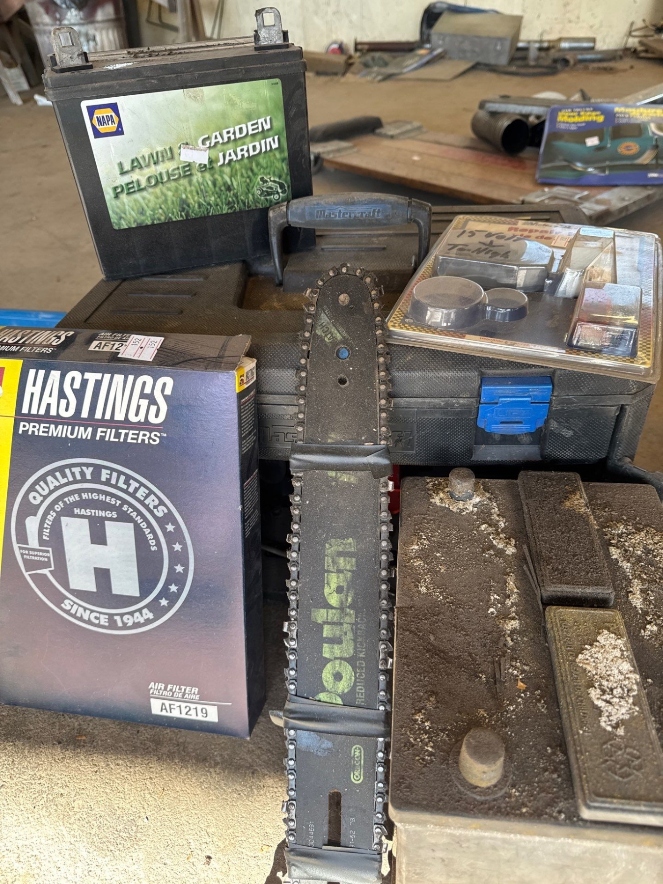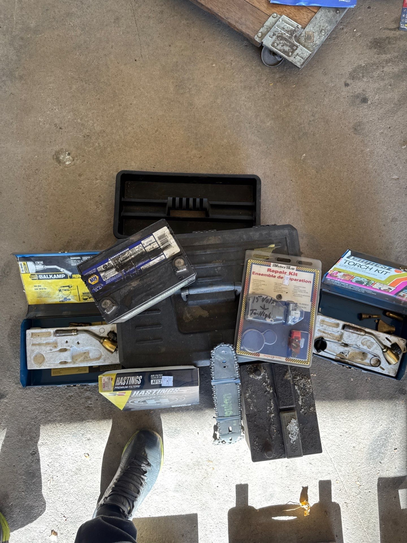 Tempus torch kit, two of them, Mastercraft toolbox, Hastings premium air filter, couple of batteries and chainsaw bar with chain for a pool and pro