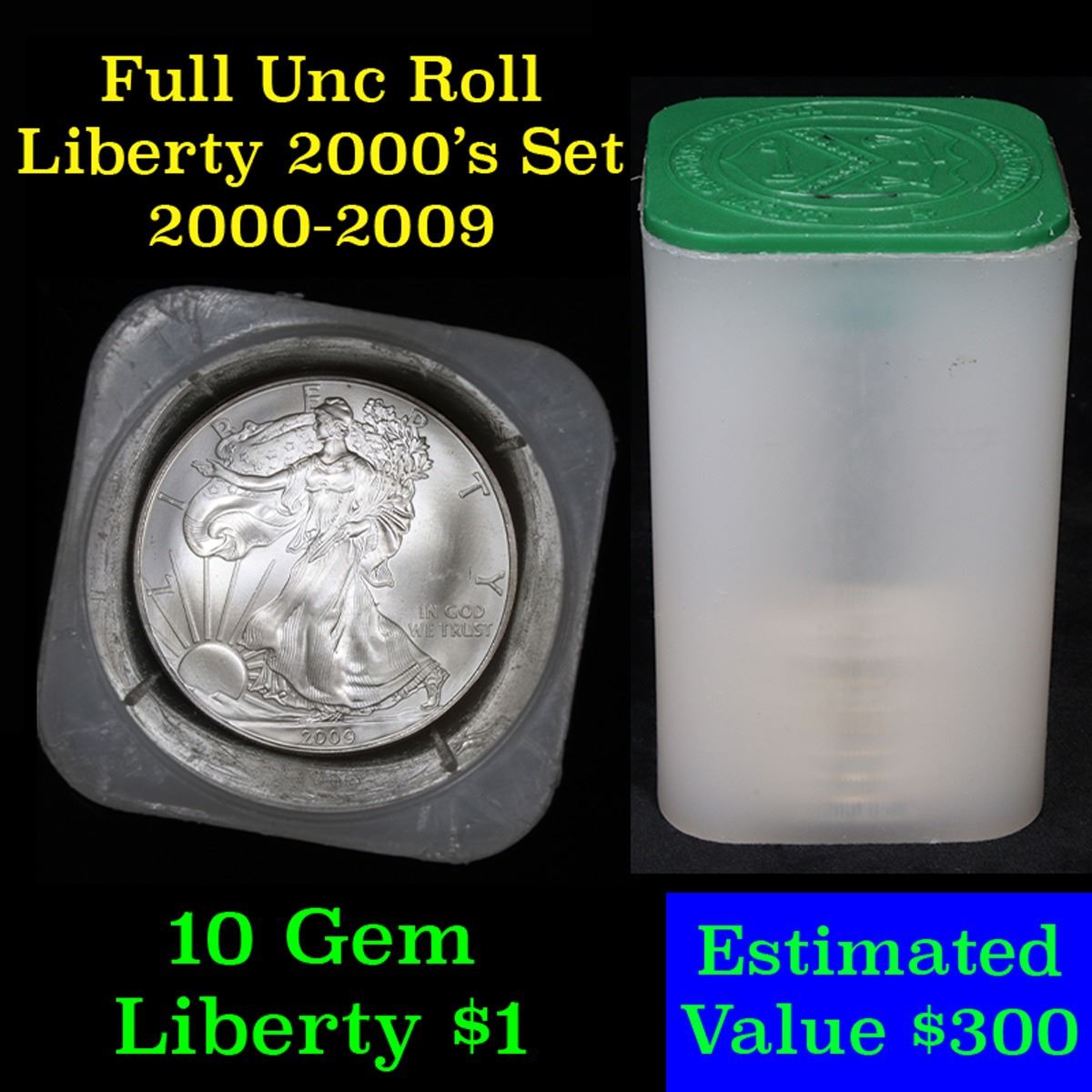 Ten (10) years of Silver Eagle $1 2000-2009 10 coins. The lot is for 10 Silver Eagle coins, years 2000-2009. Some of them have some pretty toning, others have golden toning. A nice group.