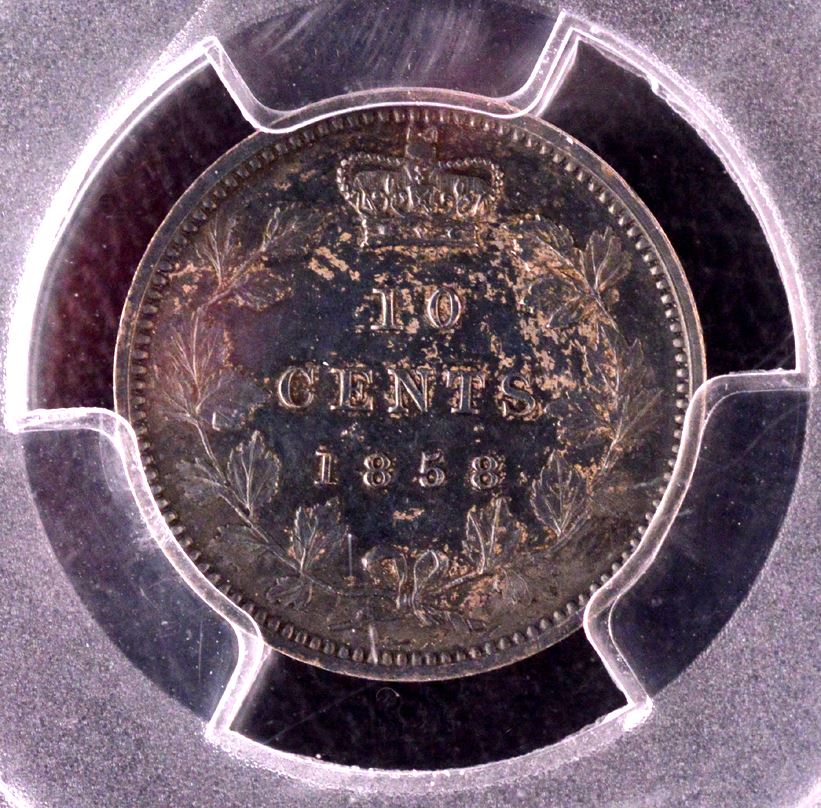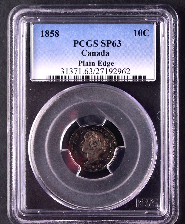 Ten Cents, 1858, Plain Edge, Specimen-63, with medium colour over irridescent surfaces. Nice coin for the grade.