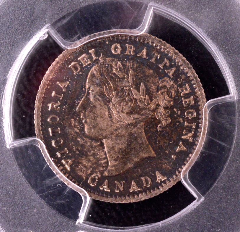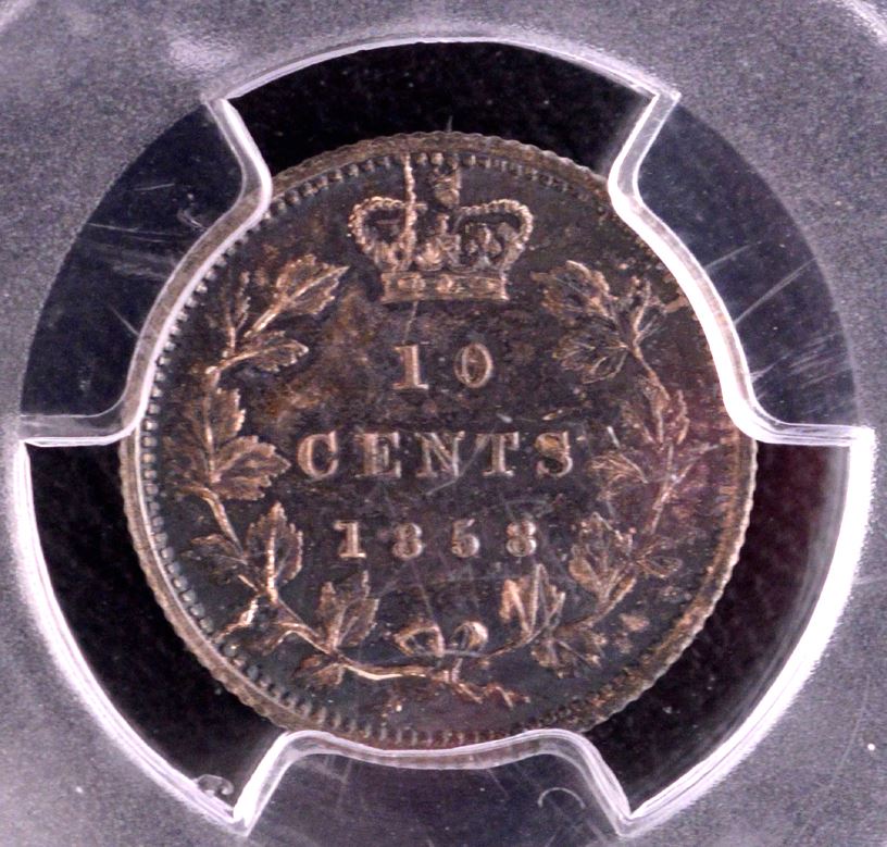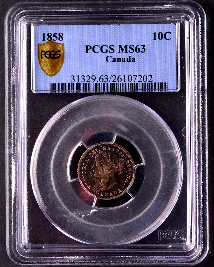 Ten Cents, 1858, graded Mintstate-63, by PCGS. Medium original colour. From an 1858 Currency set, with consecutive PCGS numbers.