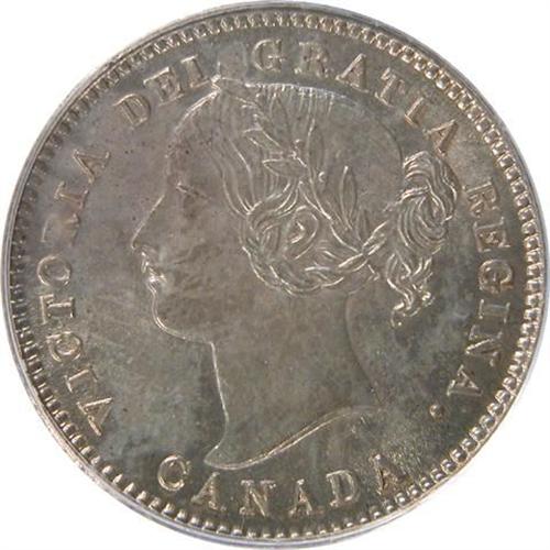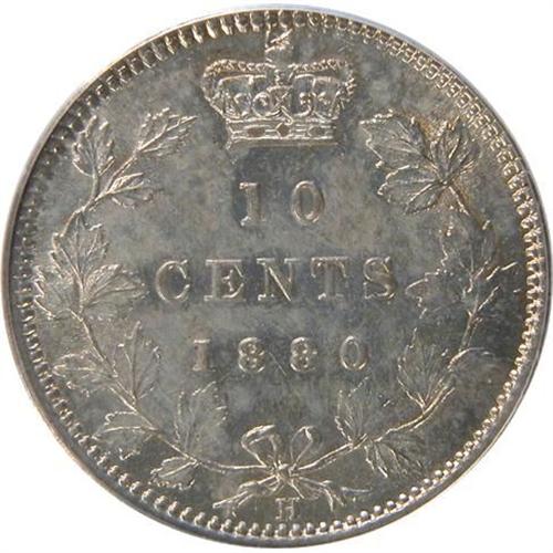 Canada Ten Cents 1880H Obverse 1, PCGS MS-62. This is a fully struck and nicely lustrous piece with pale golden toning. The scarcer of the two obverse varieties