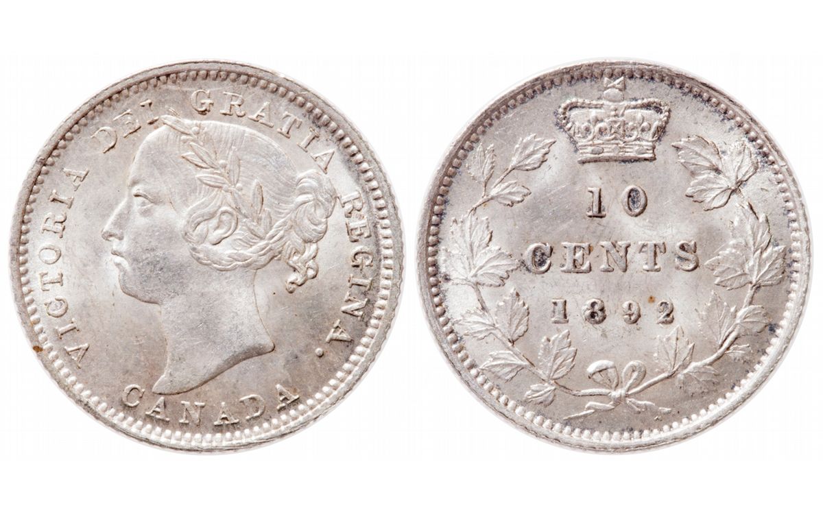 Ten Cents. 1892. Small 9. Obverse port. #5. ICCS Mint State-65. A brilliant example with frosty and satiny fields. Tied for the second 'Finest' graded by ICCS.