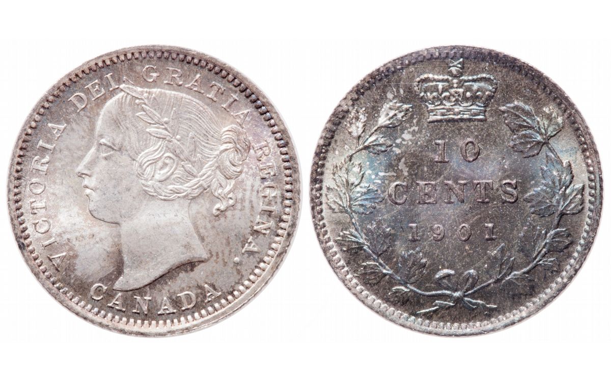 Ten Cents. 1901. ICCS Mint State-66. Very light rainbow toning over full underlying luster. Excellent 'eye appeal'. Another outstanding Gem. Tied for the second 'Finest' graded by ICCS.