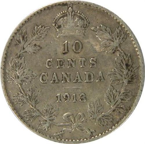 Canada Ten Cents 1913 Broad Leaves, ICCS VF-20. A rather sharp example with light golden toning