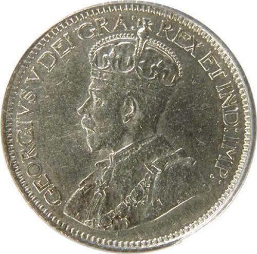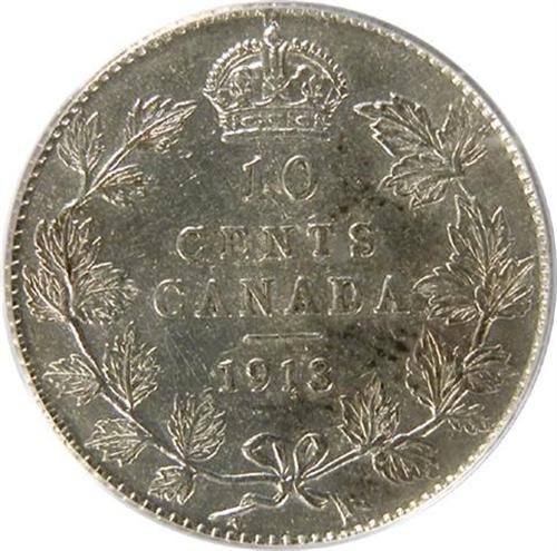 Canada Ten Cents 1913 Broad Leaves, PCGS AU-55. This is a very sharp piece with considerable remaining lustre and a pale golden toning. Only thirteen examples of this key variety have been graded higher by PCGS
