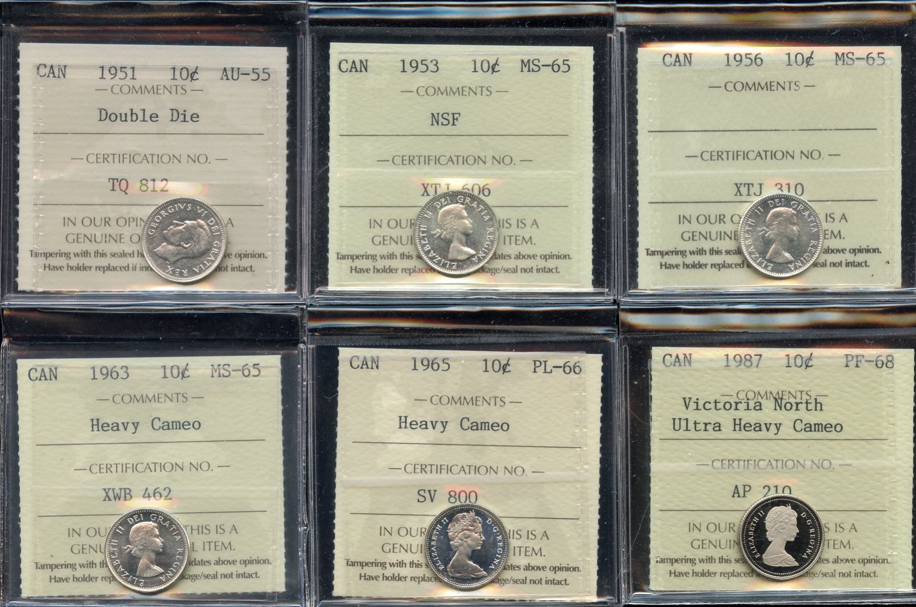 Includes: 1951 AU-55, double die. 1953 MS-65, NSF. 1956 MS-65. 1963 MS-65, heavy cameo. 1965 PL-66, heavy cameo. 1987 PF-68, Victoria North, UHC. 6 Pcs.