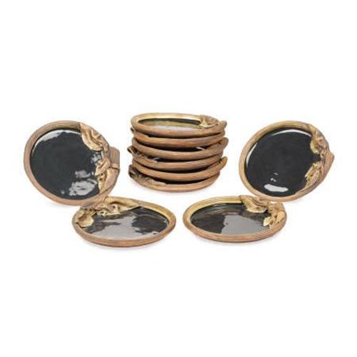 <B>Ten American Ceramic Plates<BR></B></I>Terrafirma Ceramics USA<BR>1987<BR>The glazed greyish blue plates, the rims overlayed in a textural bisque finish biscuit colour with grapes and vine decoration<BR>Incised signature to the underside <I>Terrafirma Ceramics USA 1987SE<BR></B></I>9.2 inches diameter <BR><BR><b>Shipping:</b> Requires 3rd Party Shipping (<a target="_blank" href="http://www.heritageauctions.com/common/shipping.php">view shipping information</a>)
