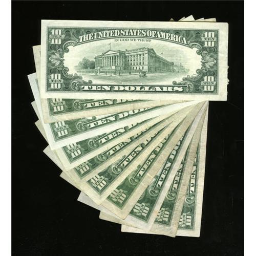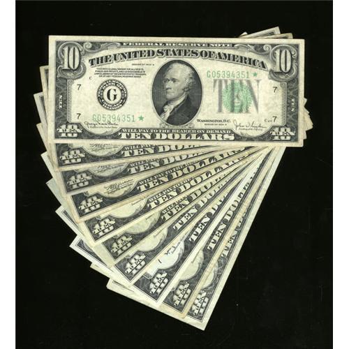 <B>Ten Chicago $10 Stars.</B></I><BR> The 1934, A, B, D stars grade <B>Very Fine</B></I> while there is a mixture of stars from the 1950D series and 1963 - 1993 which primarily grade <B>Very Fine</B></I> with an <B>AU</B></I> or two thrown in for good measure.<BR><BR><b>Shipping:</b> Coins & Currency (<a target="_blank" href="http://www.heritageauctions.com/common/shipping.php">view shipping information</a>)