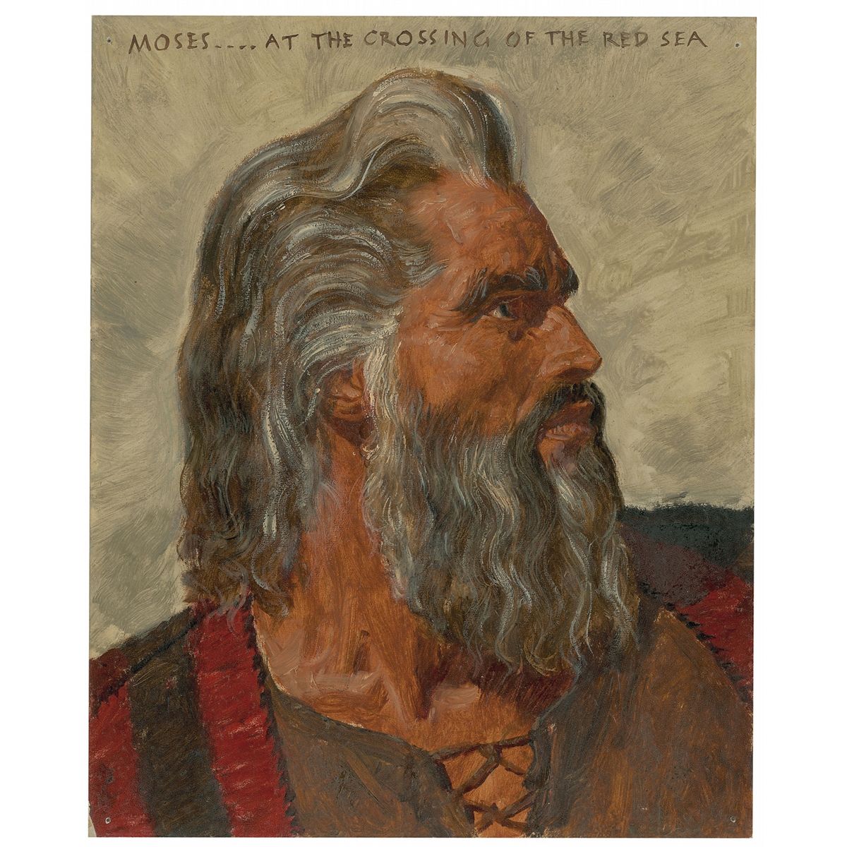 One-of-a-kind original hand-painted concept art of Charlton Heston as Moses in Cecil B. deMille’s classic, The Ten Commandments. The unsigned oil painting is done on an 8.5 x 10.5 artist’s board and was commissioned directly by deMille and painted by Wally Westmore, the make-up supervisor of the film, with his designs executed by his brother Frank, both members of the prominent Westmore family of make-up artists. The image shows a bearded Heston in profile, sporting flowing salt-and-pepper hair and a matching beard, and dressed in a red and brown tunic, and is headed along the top, “Moses…At the Crossing of the Red Sea.” Reverse is notated in pencil in an unknown hand, “Red Sea,” and “Mark Westmore Archives.” In very fine condition, with a single small tack hole to each corner tip. Provenance: The Westmore family.