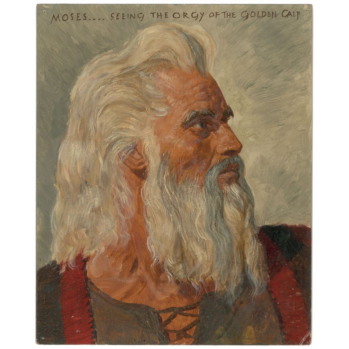 One-of-a-kind original hand-painted concept art of Charlton Heston as Moses in Cecil B. deMille’s classic, The Ten Commandments. The unsigned oil painting is done on an 8.5 x 10.5 artist’s board and was commissioned directly by deMille and painted by Wally Westmore, the make-up supervisor of the film, with his designs executed by his brother Frank, both members of the prominent Westmore family of make-up artists. The image shows a bearded Heston in profile, sporting long white hair and a matching beard, and dressed in a red and brown tunic, and is headed along the top, “Moses…Seeing the Orgy of the Golden Calf.” Reverse is notated in pencil in an unknown hand, “Golden Calf 4th Sinai,” and “Mark Westmore Archives.” In fine condition, with a single small tack hole to each corner tip, as well as a small crease to one corner tip. Provenance: The Westmore family.