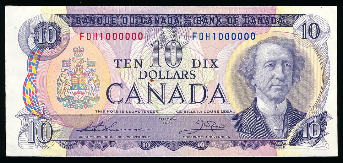 Bank of Canada, Ten Dollars, 1971, Thiessen Crow, BC-49e, prefix FDH, Million serial number 1000000. An original EF-AU.
