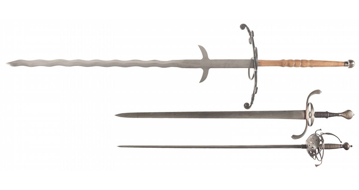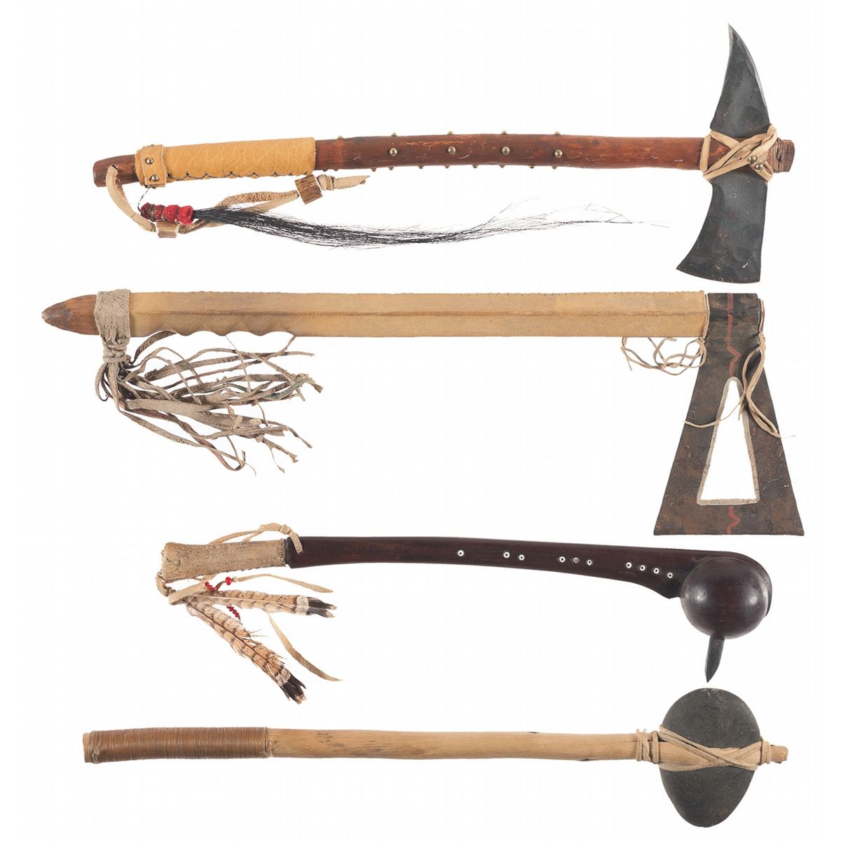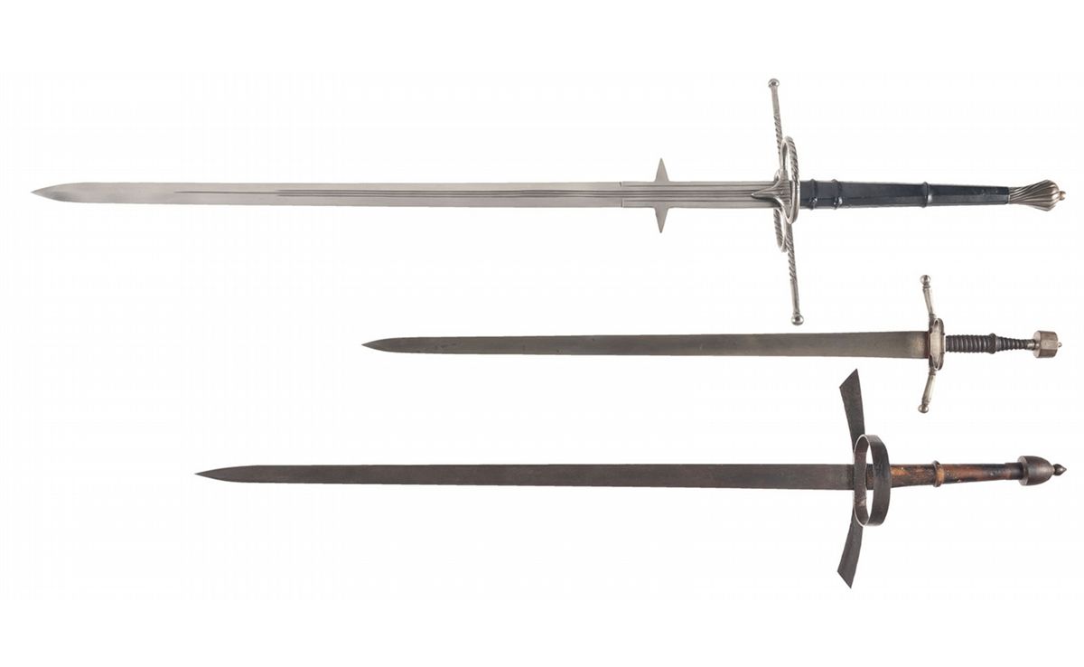 1) Reproduction Tomahawk, 2) Reproduction Tomahawk, 3) Reproduction spiked war club, 4) Reproduction stone war club, 5) Zweihander, 6) Long sword, 7) German style rapier, 8) Zweihander, 9) Long sword and 10) Great sword. All good or better.
