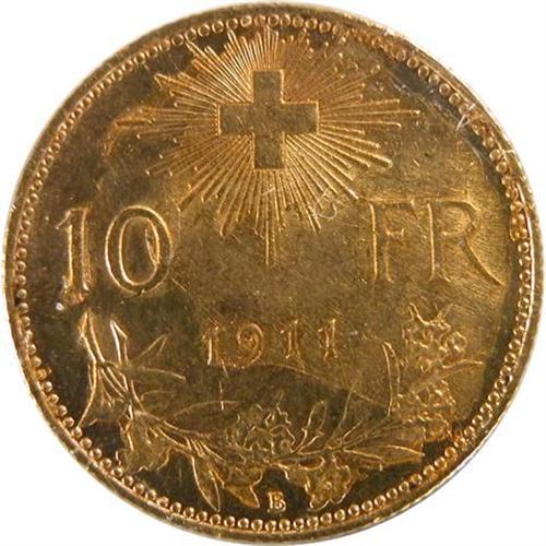 Ten Francs 1911B Uncirculated, Planchet Flaw. A thin piece covering an area of about half the reverse had flaked away before striking