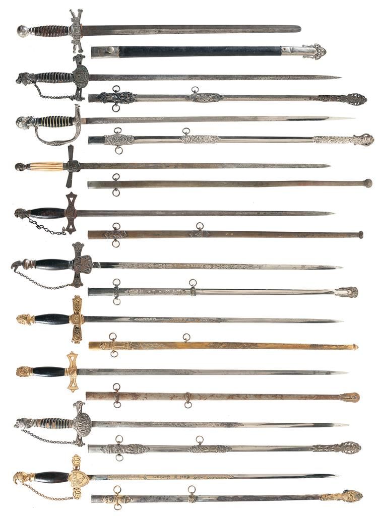 One International Order of Odd Fellows Team Degree short sword, one Knights of Pythias Uniform Ranks sword (Manufacturer: Harding Uniform and Regalia, Blade etched: "David Rosenthal"), one Patriotic Order of the Sons of America sword (Manufacturer: W.C. Rowland, Philadelphia, PA), one Brotherhood of the Union sword (Secret Society circa 1870), one Knights of the Wise Men sword (Post Civil War African-American Fraternal Organization), one VFEP sword (Manufacturer: M.C. Lilly and Co, Columbus, Ohio), one International Order of Odd Fellows sword (Manufacturer: M.C. Lilly and Co., Columbus, Ohio), one Ancient Order of United Workmen sword (Manufacturer: G.F. Foster Sons and Co. Chicago, IL., Engraved "J.A. Morris" Circa 1880), one Knights of Pythias sword (Manufacturer: E.A. Armstrong Co., Chicago), and one Ancient Order of United Workmen sword (Manufacturer: M.C. Lilley and Co., Columbus, Ohio, Blade etched: "Earl Gardner"). All swords have scabbards. Fair to Good.