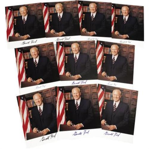 <B>Ten Gerald Ford Signed Color Photographs,</B></I> 8” x 8.5”. The nation's amiable 38th President has boldly autographed the lower margin of each print. Could those possibly be Reader's Digest Condensed Books on that shelf in the background? Excellent condition.<BR><BR><b>Shipping:</b> Flat Material, Small (<a target="_blank" href="http://www.heritageauctions.com/common/shipping.php">view shipping information</a>)