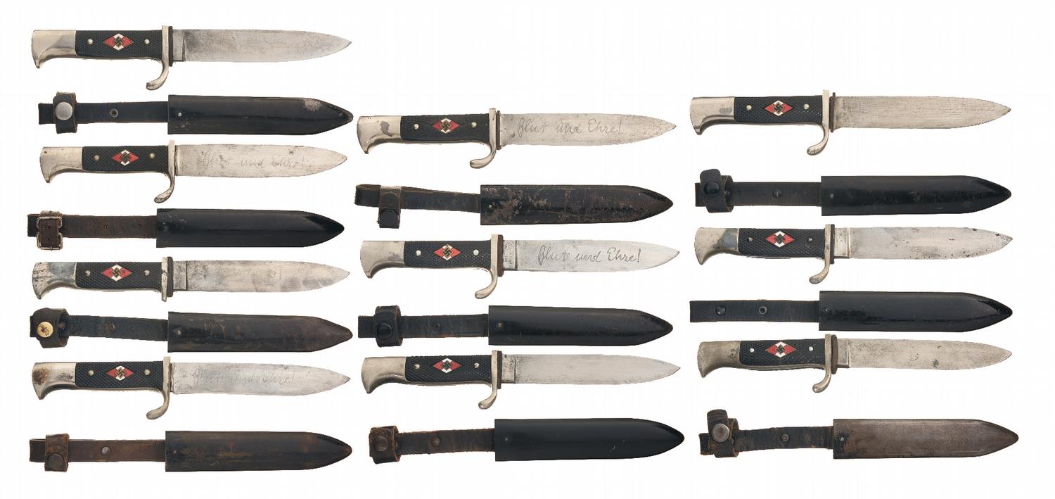 Established in 1926, the Hitler-Jugend, Bund Deutscher Arbeiterjugend (Hitler Youth, League of German Worker-Youth) started as a training ground for future SA members, and was later tapped as a source for Volkssturm fighters in the last days of the Reich. Many Volkssturm units found themselves facing off against the advancing Red Army in the Eastern Front, culminating in street fighting in the German home territories. 1)-5) All knives are fitted with nickel finished hilts, checkered grips with the HJ icon in the right panel, and metal sheath with leather hanger. 1) Pumawerk (Solingen) knife, 5 1/2" blade, no etching, Puma and RZM "M7/ 27/ 1939" markings. 2) Anton Wingen Jr (Solingen) knife, 5 3/8" blade with etching and makers mark. 3) Eickhorn (Solingen) knife, 5 5/8" blade, unetched, with makers mark and RZM "M7/66" stamp. 4) SMF (Solingen) knife, 5 3/8" blade, etched, with makers mark. 5) Tigerwerk (Solingen) knife, 5 3/8" etched blade, makers mark on the reverse. 6)-10) All knives are from Solingen makers, fitted with nickel finished hilts, checkered grips with the HJ icon in the right panel, and metal sheath with leather hanger. 6) Robert Klass knife, 5 3/8" etched blade, Klass and RZM "M7/ 37/ 1936" markings on the ricasso. 7) Paul Seilheimer knife, 5 3/8" blade, not etched, with RZM "M7/38" mark. 8) Hartkopf knife, 5 3/8" blade, unetched, with makers mark. 9) Weyersberg knife, 5 1/2" blade, unetched, with makers mark and RZM "M7/42/ 1939" stamp. Retaining belt absent from sheath. 10) Gustav Spitzer knife, 5 3/8" unetched blade, RZM "M7/80/ 39" mark.