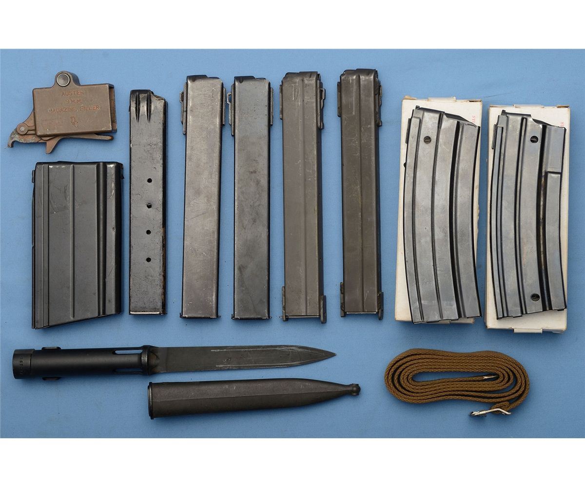 4 original boxed Ruger Mini 14, 30 round magazines, 1 FAL metric 20 round magazine, 5 9mm 20 round magazines, 1 " AUSTEN/9 MM/MAGAZINE FILLER/DC" marked device, a FAL bayonet with scabbard and 1 web strap/sling. CONDITION: Good to very good overall.