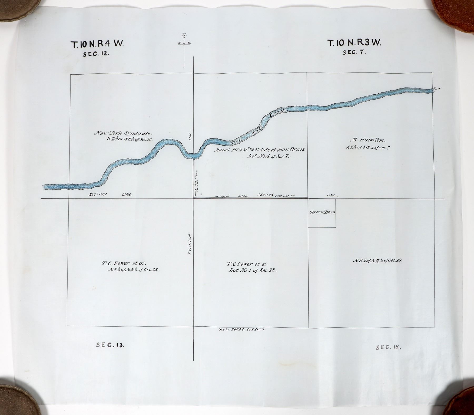Map of Ten Mile Creek, probably in Montana. Scale 200ft=1". Plots for NY Syndicate, Anton Brass, T C Power etc. 21x23".