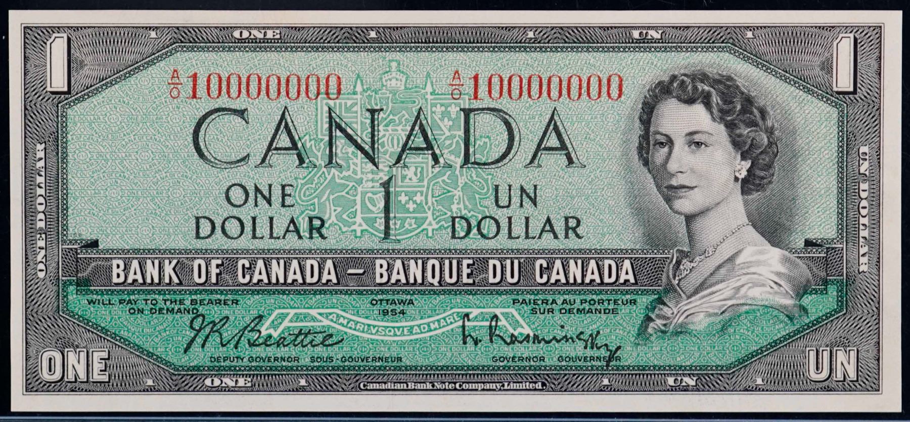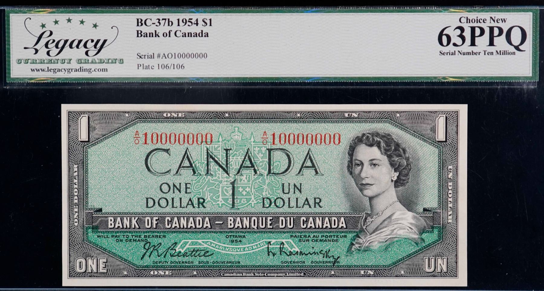 Ten Million Note; 1954 $1 BC-37b #AO10000000, Legacy Currency Grading Choice Uncirculated-63PPQ. Expect strong bidding. A similar example brought in $19,552 at our 2023 Extravagenza auction.