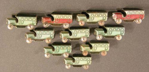 Ten penny toy busses - red and blue, ex. cond.
