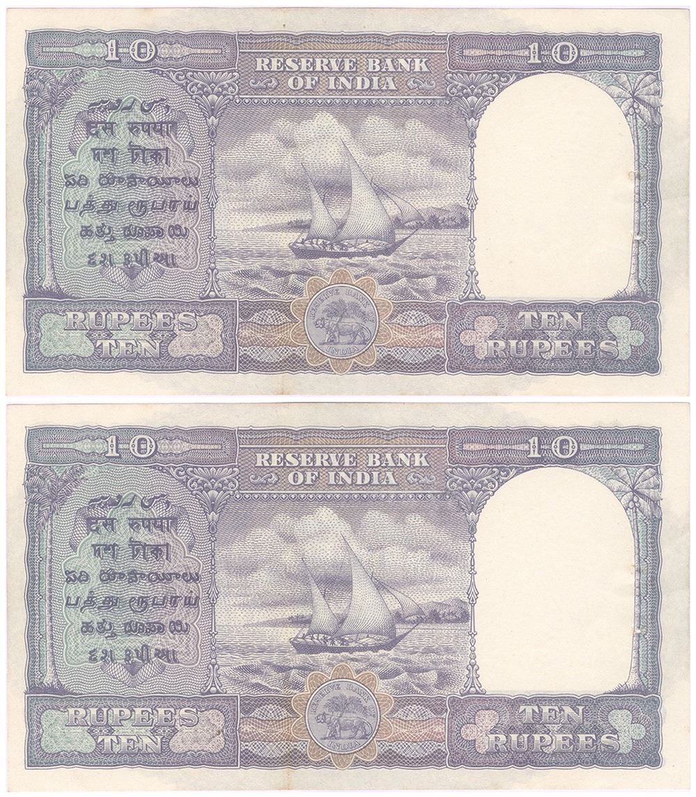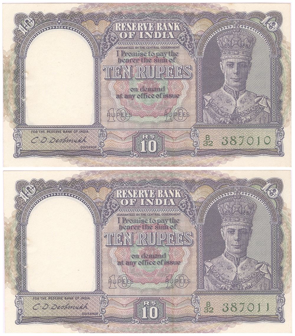 King George VI, 1944, 10 Rupees (2), C. D. Deskmukh,Consecutive Pair,S.No. B32 387010 B32 387010,Gem Uncirculated,Rare.
