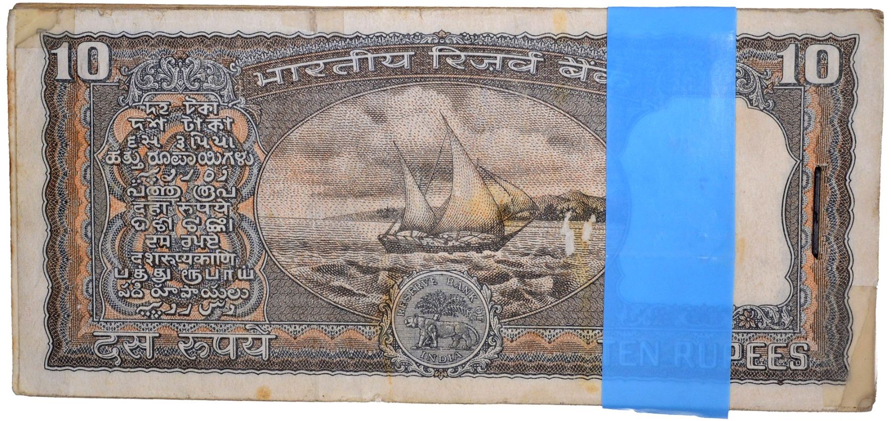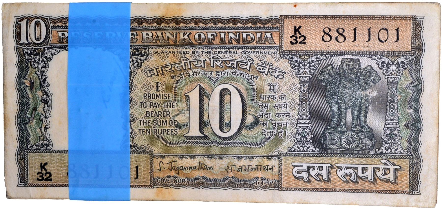 Republic India,1970,10RupeesBundle(100 Notes),Signed byS. Jagannathan,KPrefix, S. No. K32 881101 to 881200, (KJ RR # 6.4.8.1A/RM AM # R4.13), pinholes,minor stains, graffiti on a first note,choice very fine, UNC.