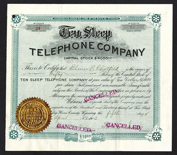 Wyoming. 50 Shrs Stock Certificate. Issued. Cancelled. A great town name, still on the map today. Nice VF+