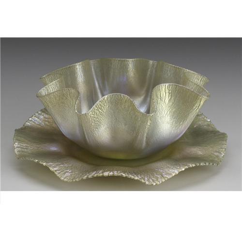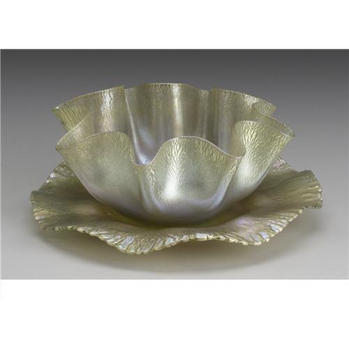 <B>A Set of American Art Glass Bowls With Underplates</B></I><BR><BR>Tiffany Studios, New York, New York<BR>Late Nineteenth Century<BR>Glass<BR>Marks: <I>LCT U3936</B></I><BR>Bowl: 1.5 in. high x 5.7 in diameter, Underplate: 6.5 in. diameter<BR><BR>Twelve iridescent glass bowls and ten matching underplates in the 'onion skin' pattern<BR><BR>Provenance: From the collection of Rita and Richard Chouinard.