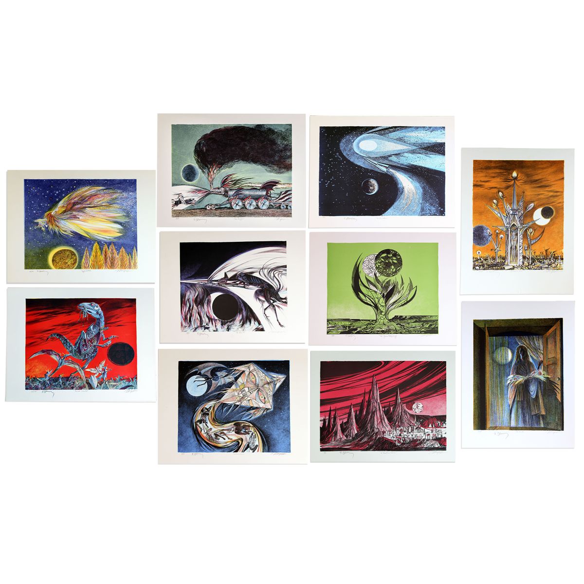 Ray Bradbury personally owned full set of ''Ten Views of the Moon'', an 1981 artistic collaboration between Joseph Mugnaini and Ray Bradbury. The artist began collaborating with Bradbury in 1952, composing the covers and interior art for several first editions of Bradbury's works. Lithographs are housed in a card-style cover with a depiction of Mugnaini's ''The Praying Mantis Vehicle'' from ''The Martian Chronicles''. Cover reads, ''The View of the Moon / Joseph Mugnaini / In collaboration with / Ray Bradbury / With an Introduction by / Norman Corwin / Lynton Kistler / Los Angeles 1981''. Interior has introductions by Bradbury and Corwin. Lithographs are each numbered ''20/150'' and are signed ''R. Bradbury'' and ''Joseph Mugnaini'', and titled by one of the two, all in pencil: (1) ''The April Witch'', (2) ''Robots: The Hunters and the Hunted'', (3) ''The Halloween Kite'', (4) ''The Visitor'', (5) ''Martian Tower'', (6) ''The Hound'', (7) ''The Green Morning'', (8) ''Leviathan 99'', (9) ''Martian Town'' and (10) ''The Dragon''. Each measures 26'' x 20'' and cover measures 20.25'' x 26''. Fine condition. With a COA from the Ray Bradbury estate.