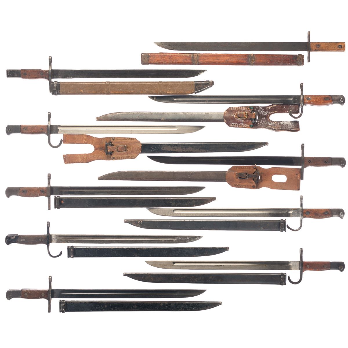 All have scabbards. 5 bayonets with a hook quillon. 5 bayonets with a straight quillon (2 have wooden scabbards, remaining are metal). Overall in very good condition.