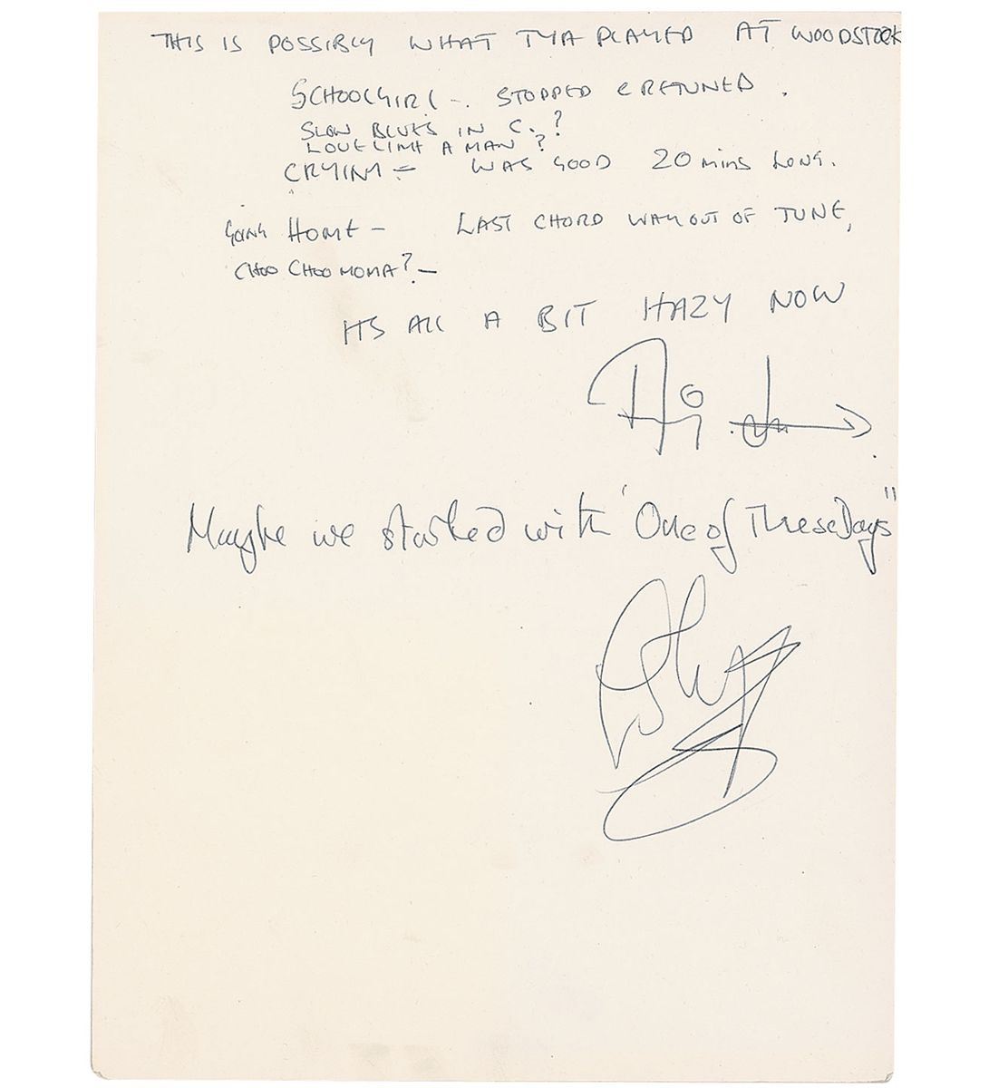 Souvenir handwritten set list for the Ten Years After’s performance at Woodstock, one page, 9 x 12, signed at the conclusion in ballpoint by both Alvin Lee and Leo Lyons. Lee pens what he remembers playing, in full: “This is possibly what TYA played at Woodstock. Schoolgirl—Stopped & Returned. Slow Blues in C? Love Like a Man? Crying—Was good 20 mins long. Going Home—Last chord was out of tune, Choo Choo Moma?—It’s all a bit hazy now.” Below, Lyons makes a slight tweak, adding, “Maybe we started with ‘One of These Days.” In fine condition. Although this performance was a highlight of Woodstock, much of it—like Lee’s memories of the event—has been lost, as the sound recording partially failed and the film crew was only able to capture their final song. As Lee mentions, the band experienced multiple technical failures during the set, most notably their guitars falling out of tune due to the high humidity.