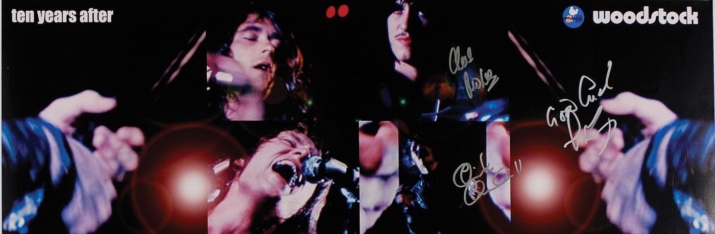 Color satin-finish 30 x 9.75 composite photo of Ten Years After performing at Woodstock, signed in silver ink by Leo Lyons, Ric Lee, and Chick Churchill. In fine condition, with a trimmed bottom edge and light surface marks.
