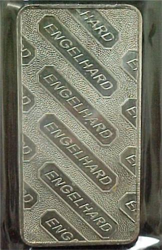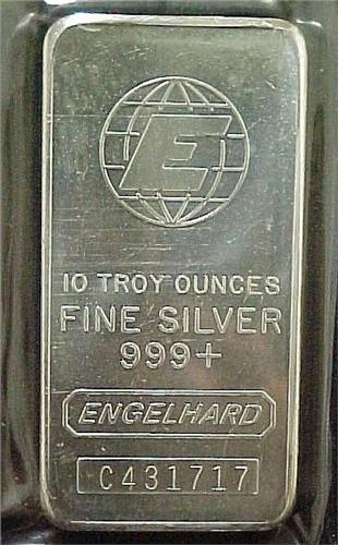 Ten ounce fine silver ingot; Engelhard C431717 fine silver 999+; ingot has not been removed from original sealed plastic case